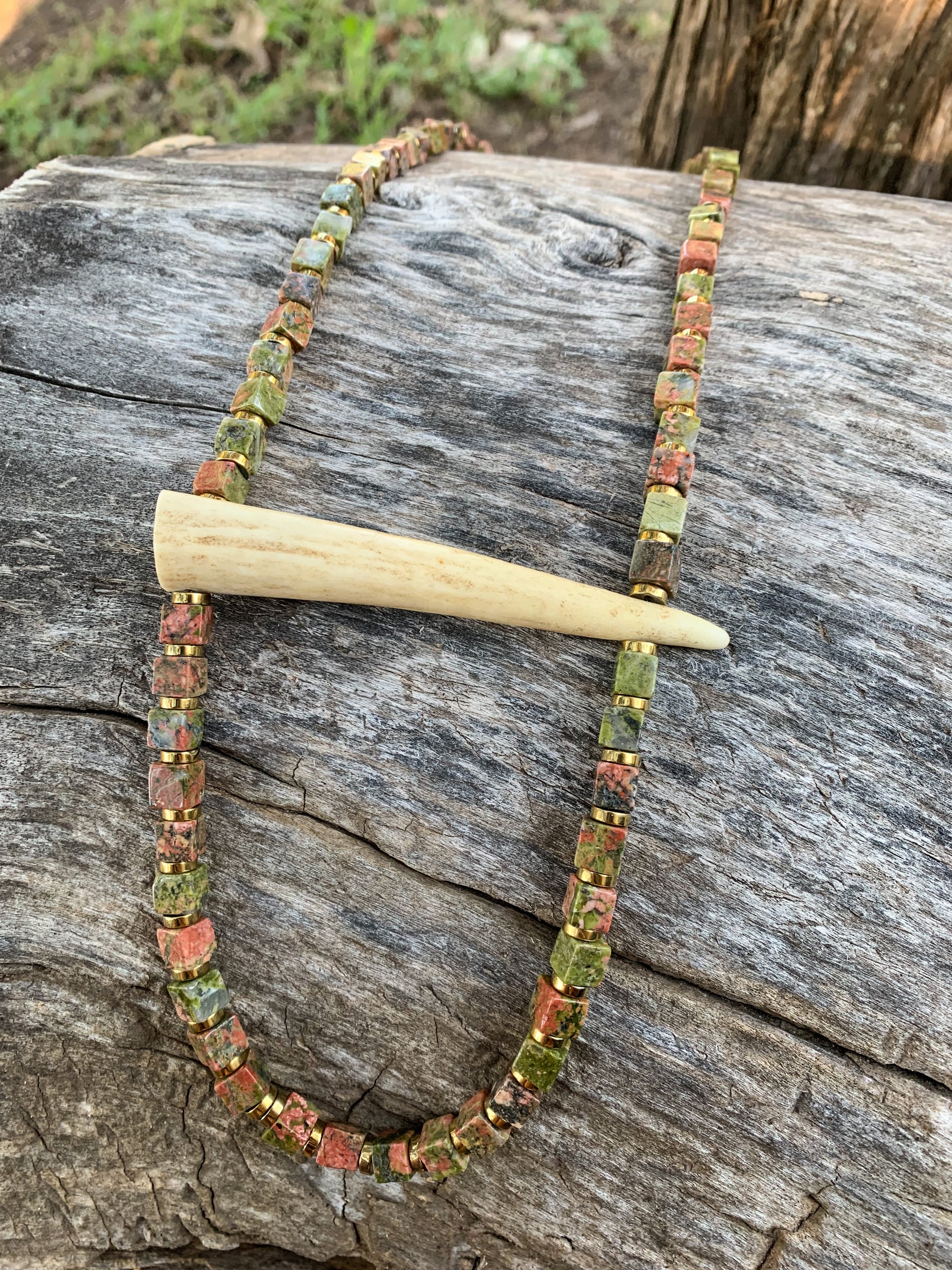 Beautiful green and pink square beads with a horizontal authentic deer antler piece in the middle! Handmade. One of a kind.