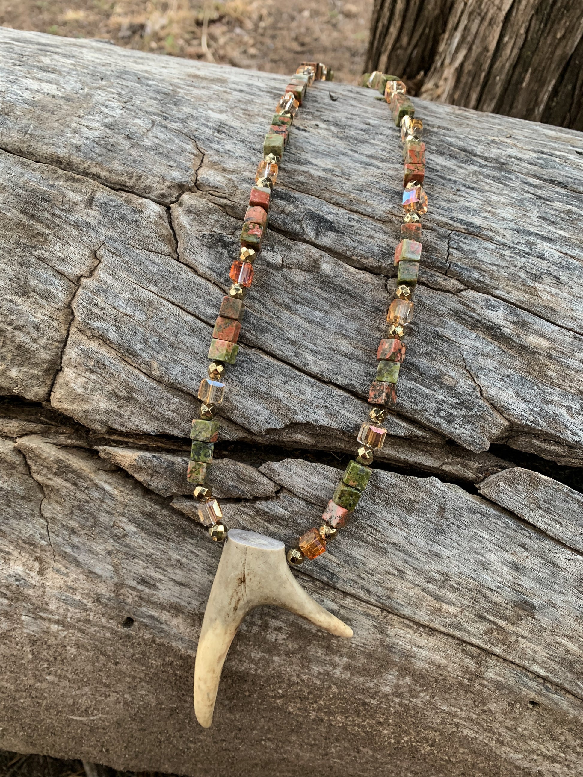 Beautiful square beads with pink and green designs on them, and gold accent beads around orange shiny square beads and an authentic whitetail antler piece in the middle. Handmade.