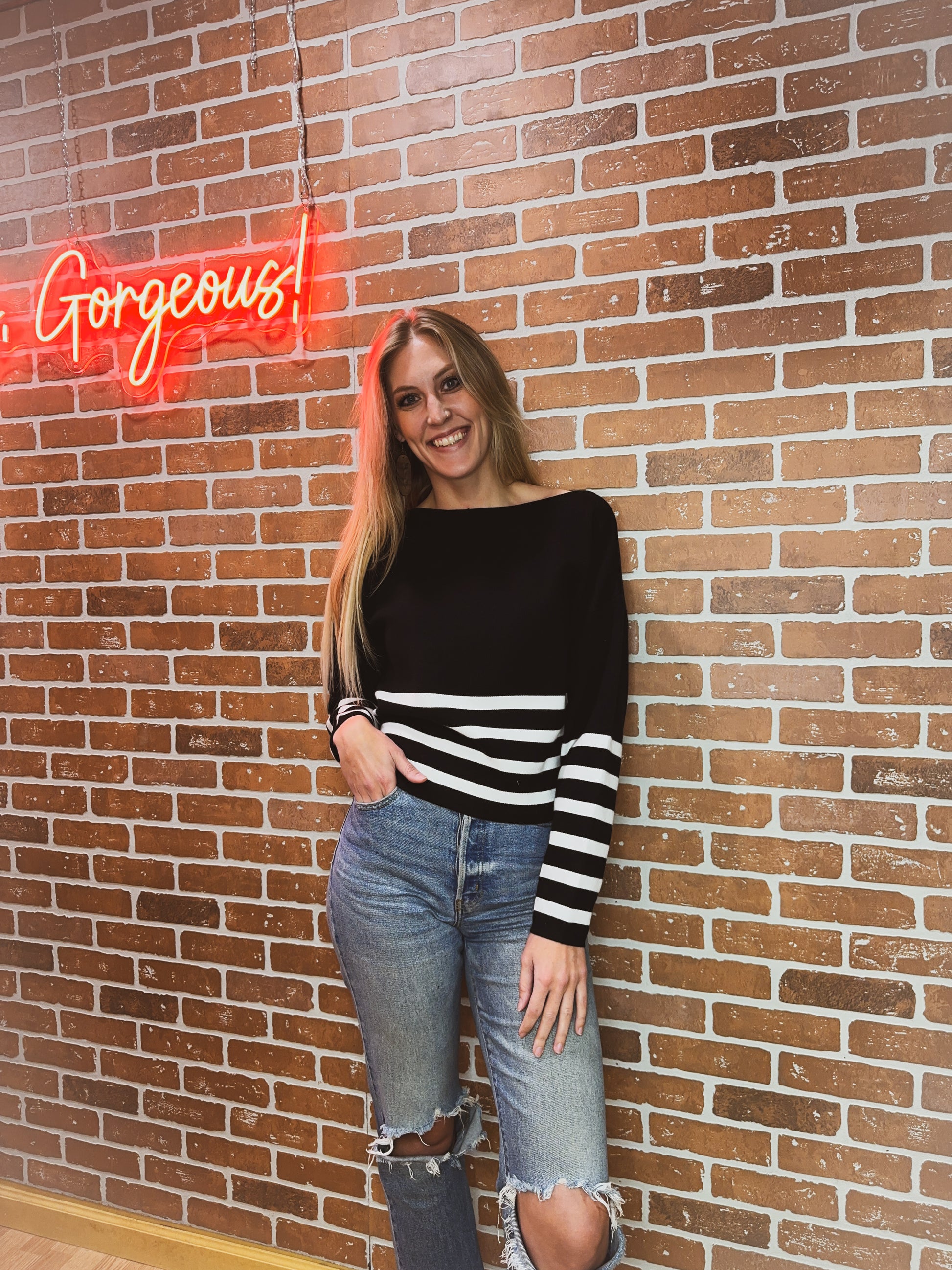 Elevate your cool-weather wardrobe with our Striped Midi Sweater. This versatile piece features a wide neck and mid length, perfect for layering or wearing on its own. The cozy stretchy fabric guarantees ultimate comfort while the striped design adds a touch of style to any outfit. Bre is wearing medium.