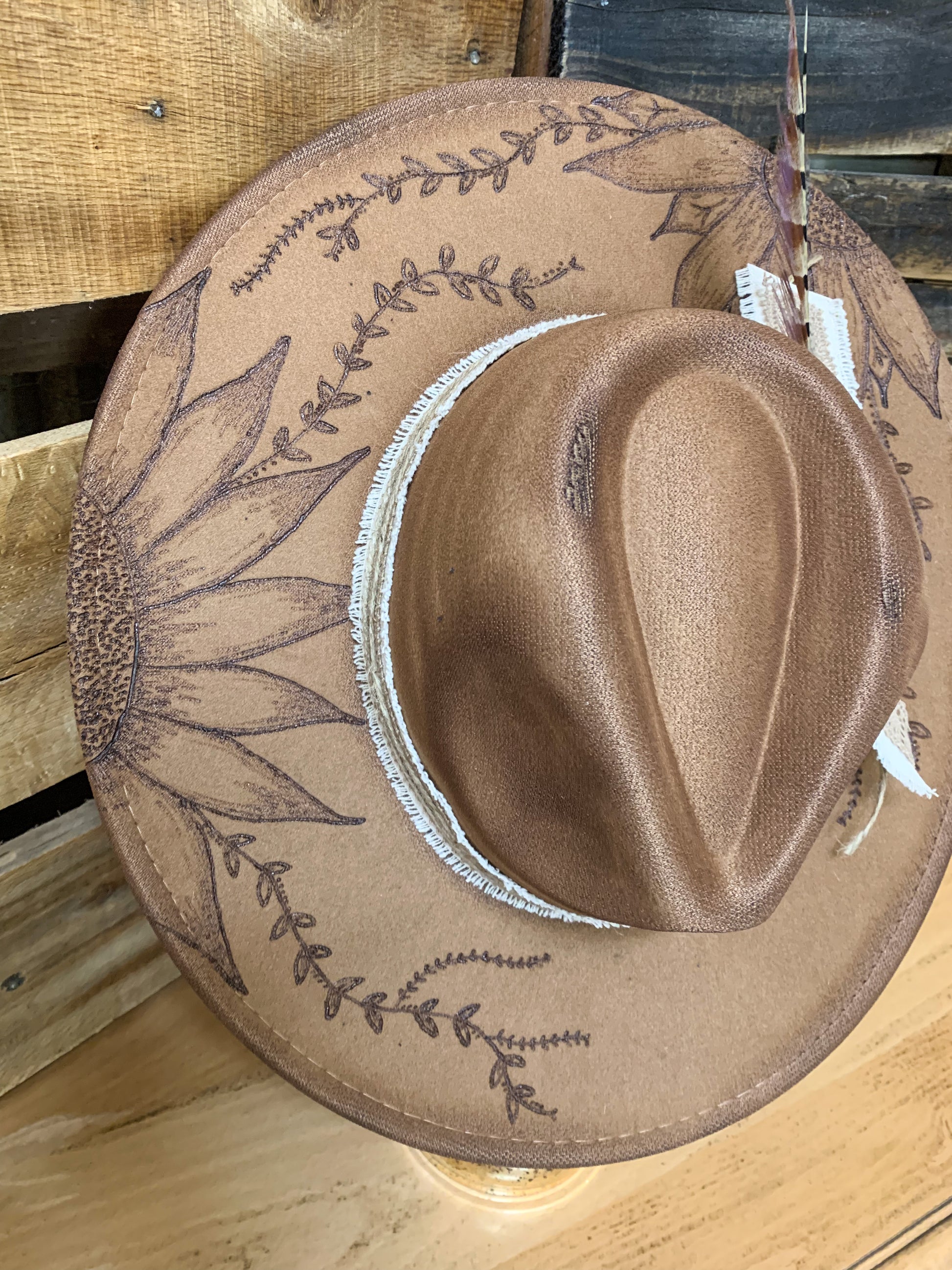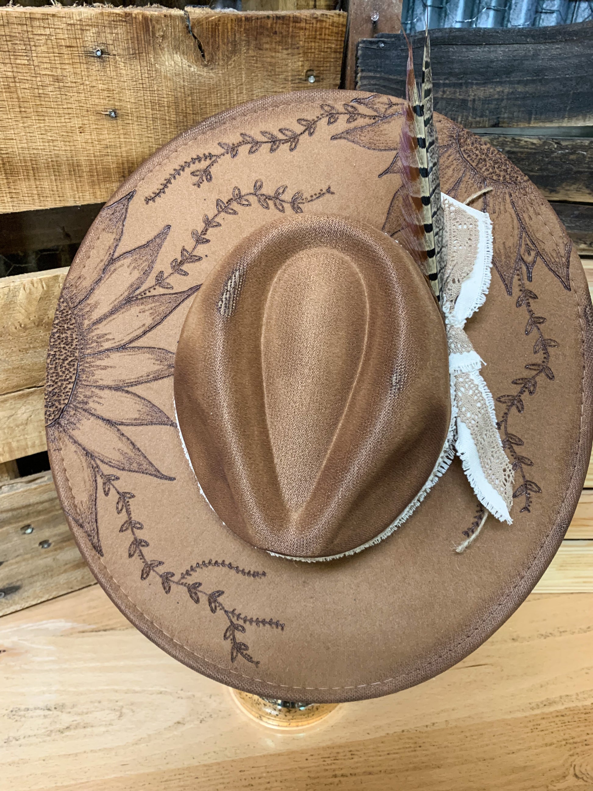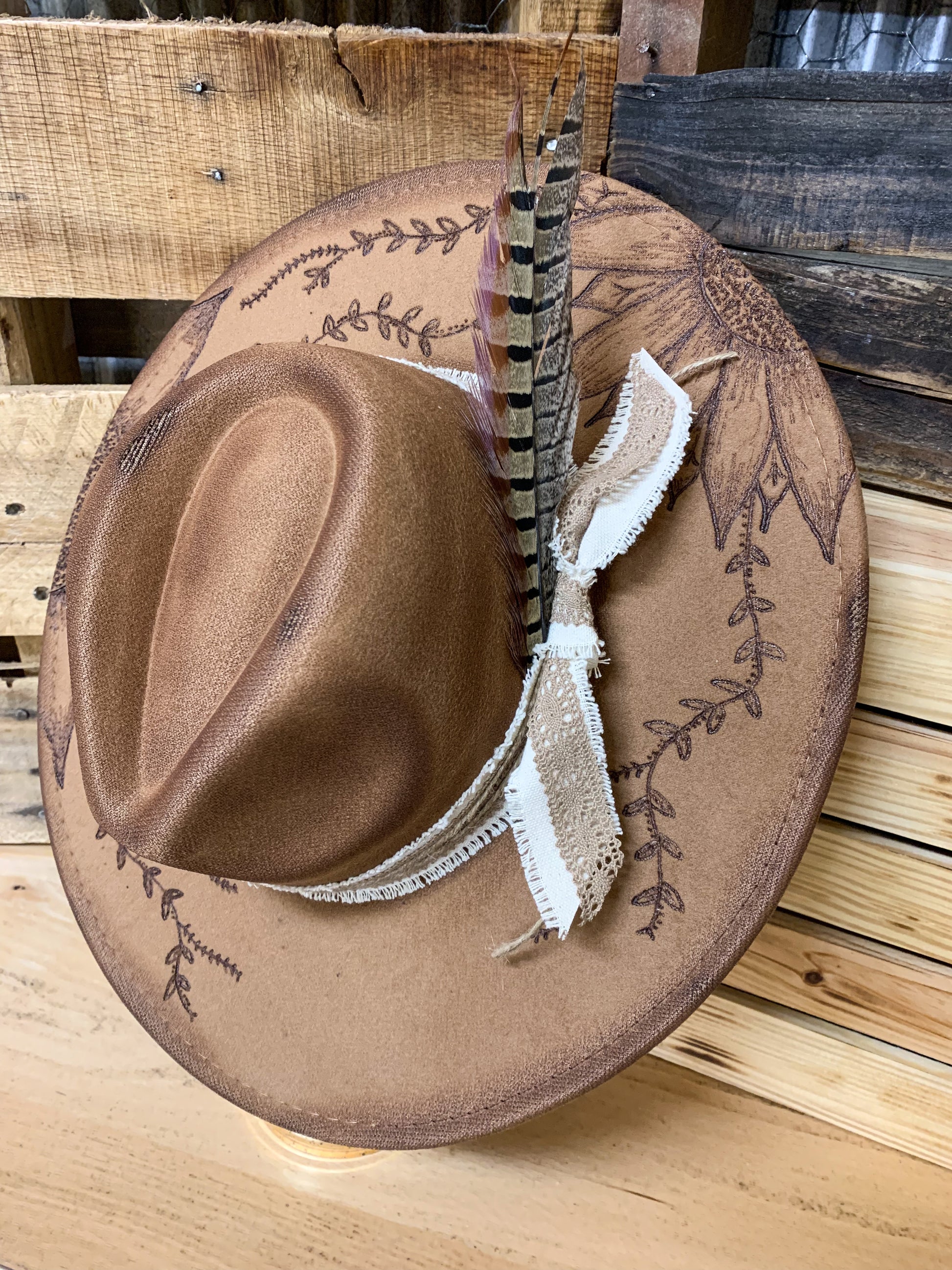 Beautiful faux felt hat with sunflowers burned into brim and fabric and twine wrapped around and tied on the side, with a fun pheasant feather! Adjustable drawstrings inside to tighten! Height 4.75”, Brim 3.5”, circumference 22”. 65% cotton, 35% polyester.