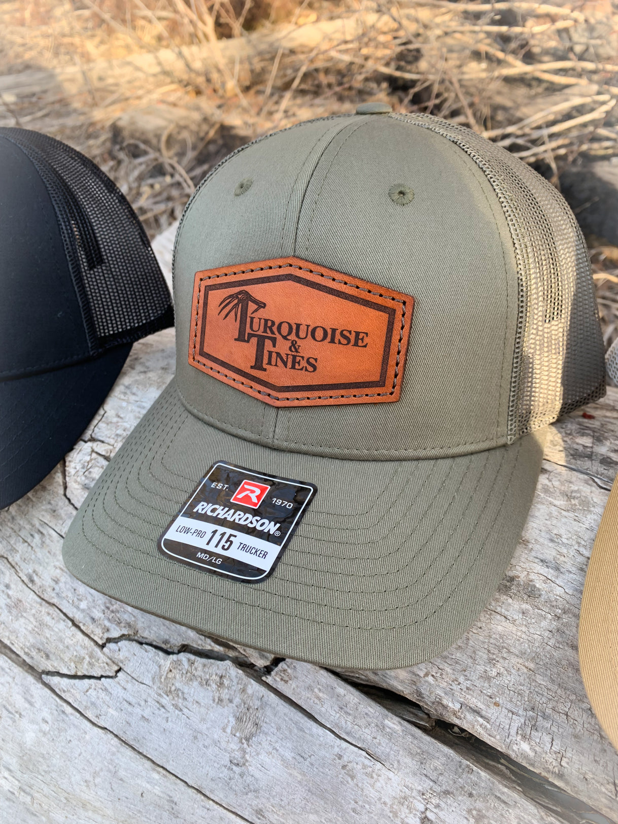 Engraved leather patch sewn onto Richardson 115 (low-profile) trucker hat. Adjustable snap back.