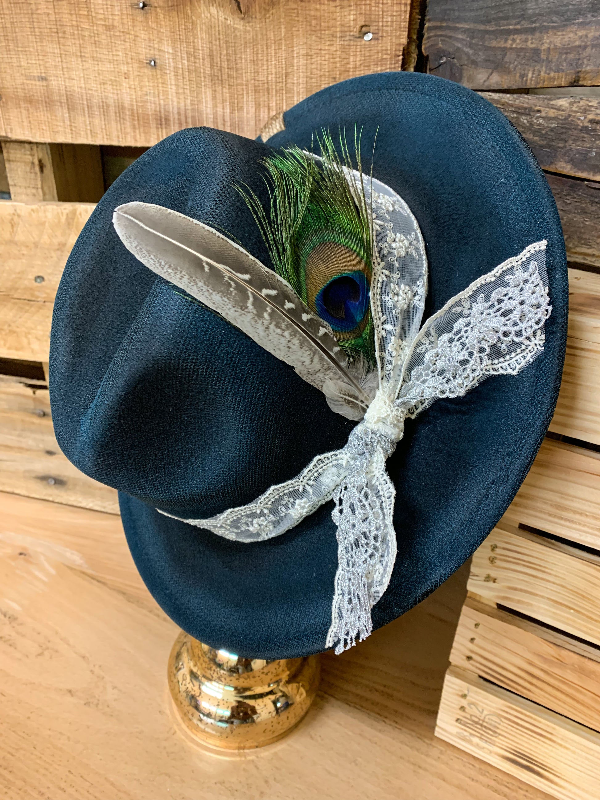 A beautiful deep teal colored hat with thick lace band and pheasant and peacock feathers on the side, and a twine wrapped brim. Drawstrings inside to tighten. 4.75” height. 2.75” brim. 22” circumference. 65% cotton, 35% polyester.