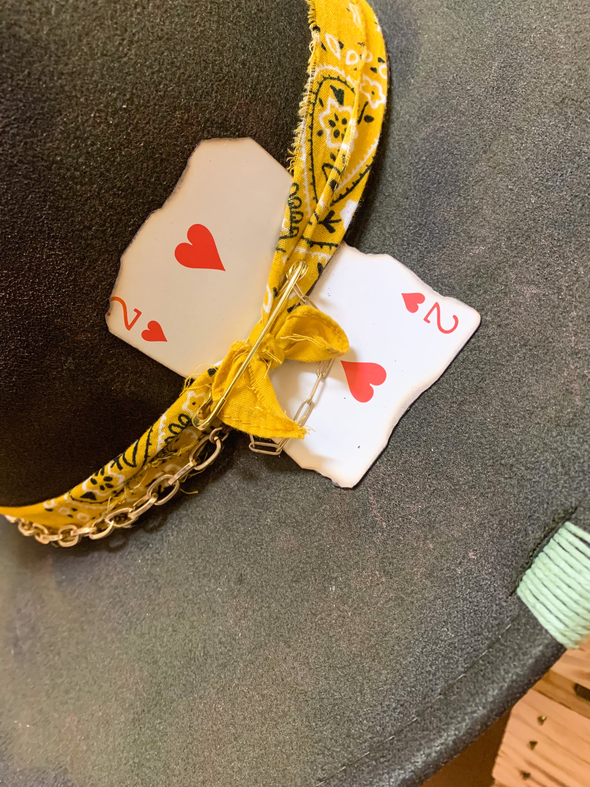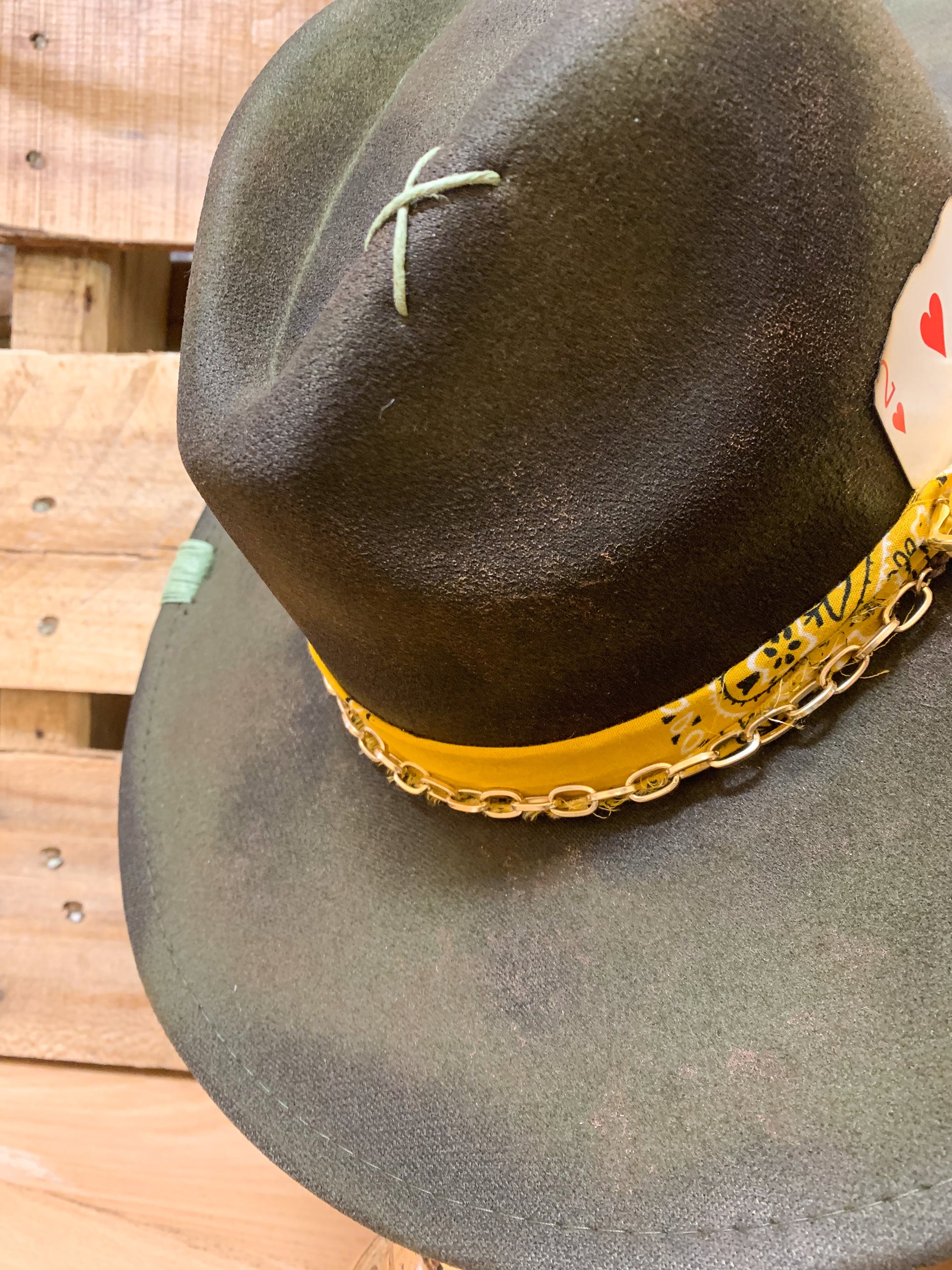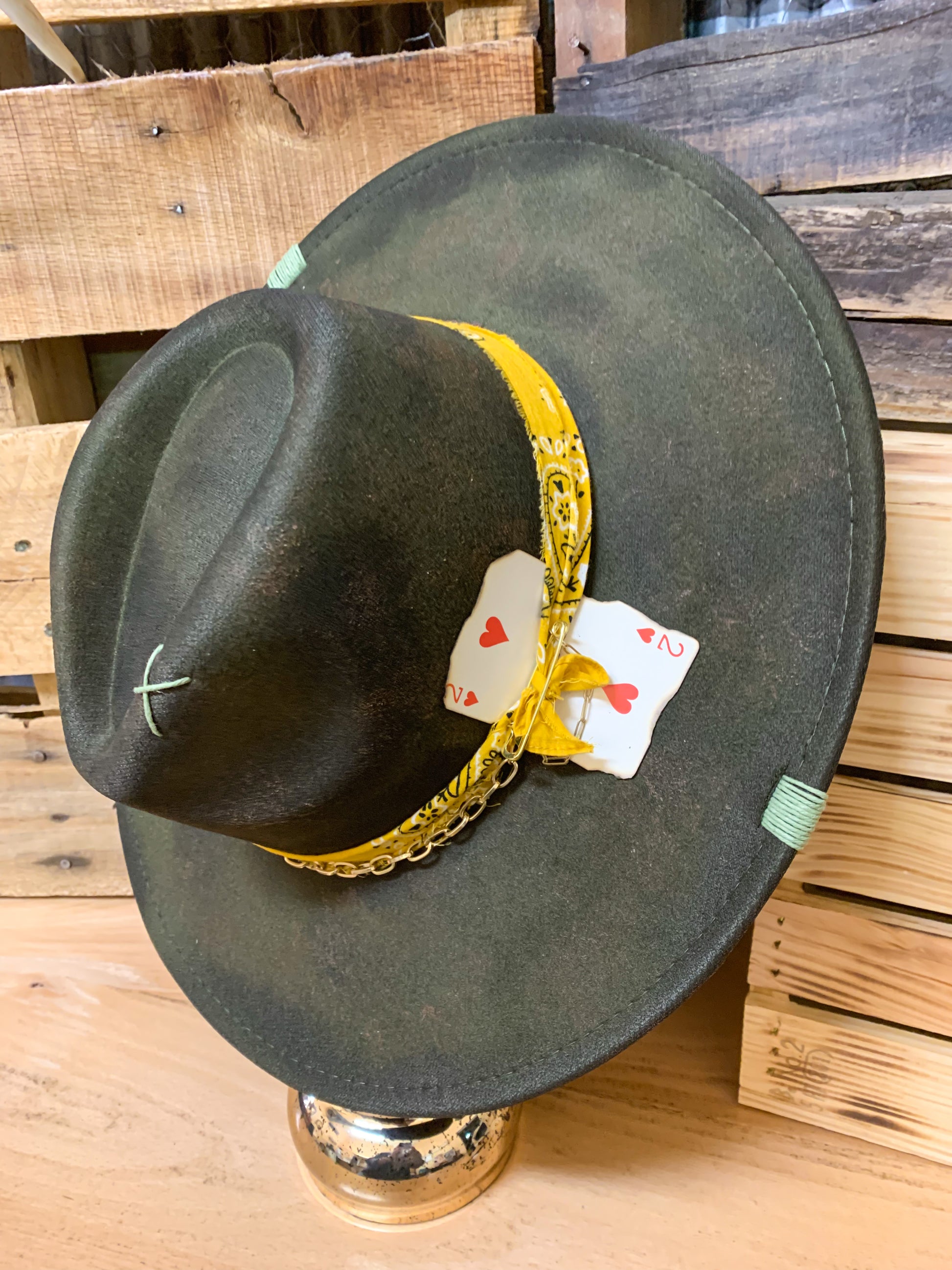 A gorgeous olive hat with a worn look and copper accents. 22” circumference with adjustable strings to tighten. 3.5” brim.