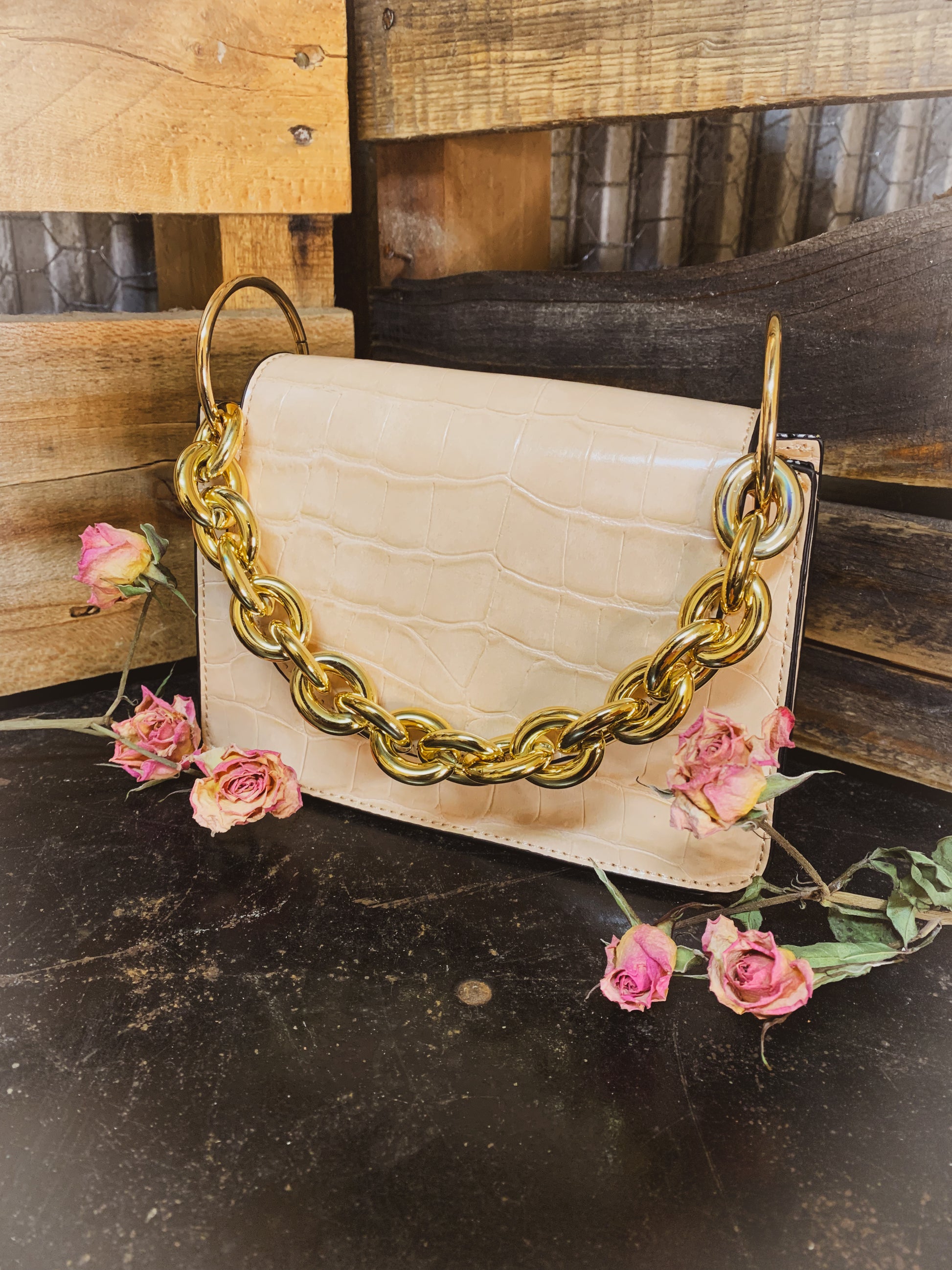 Vegan leather croc pattern purse with thick gold chain straps, and can be converted to a satchel or fanny pack as well! Adjustable strap inside. 7.5 L x 5.25 H x 3.25 W