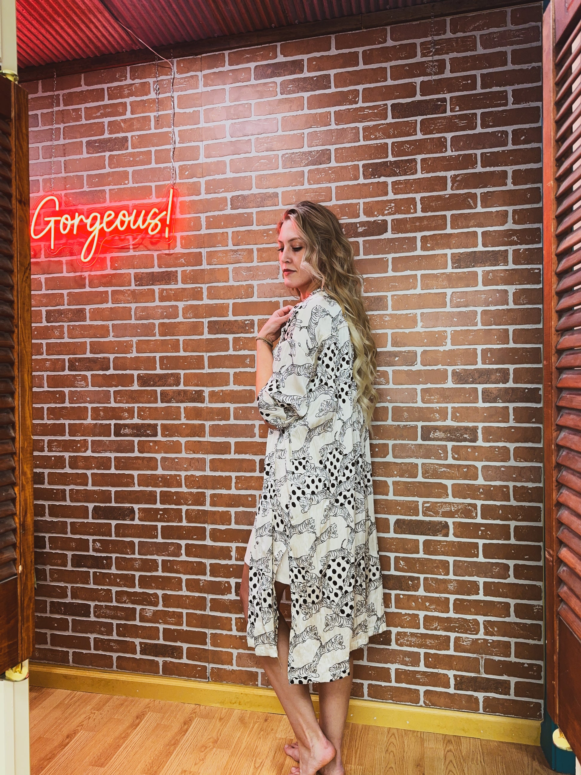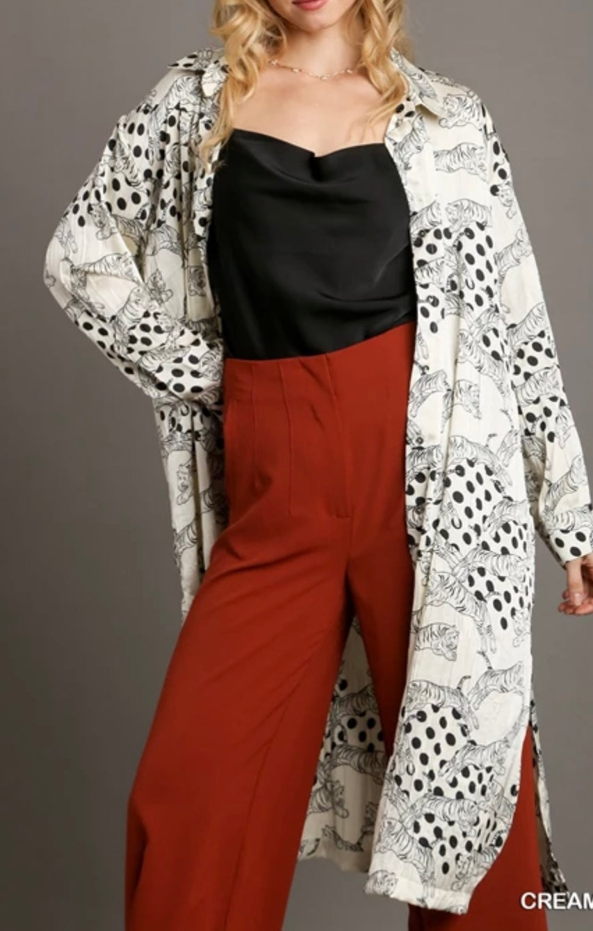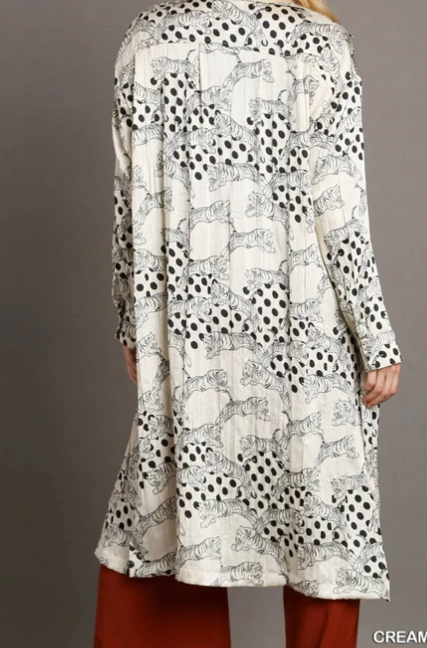 This Tiger Duster is a must-have for any fashion-forward individual. Made from satin material with a unique crinkle texture, it features a bold tiger print that adds a touch of fierceness to your everyday look. The button down design allows for easy wear and the dress/duster style offers versatility for any occasion.