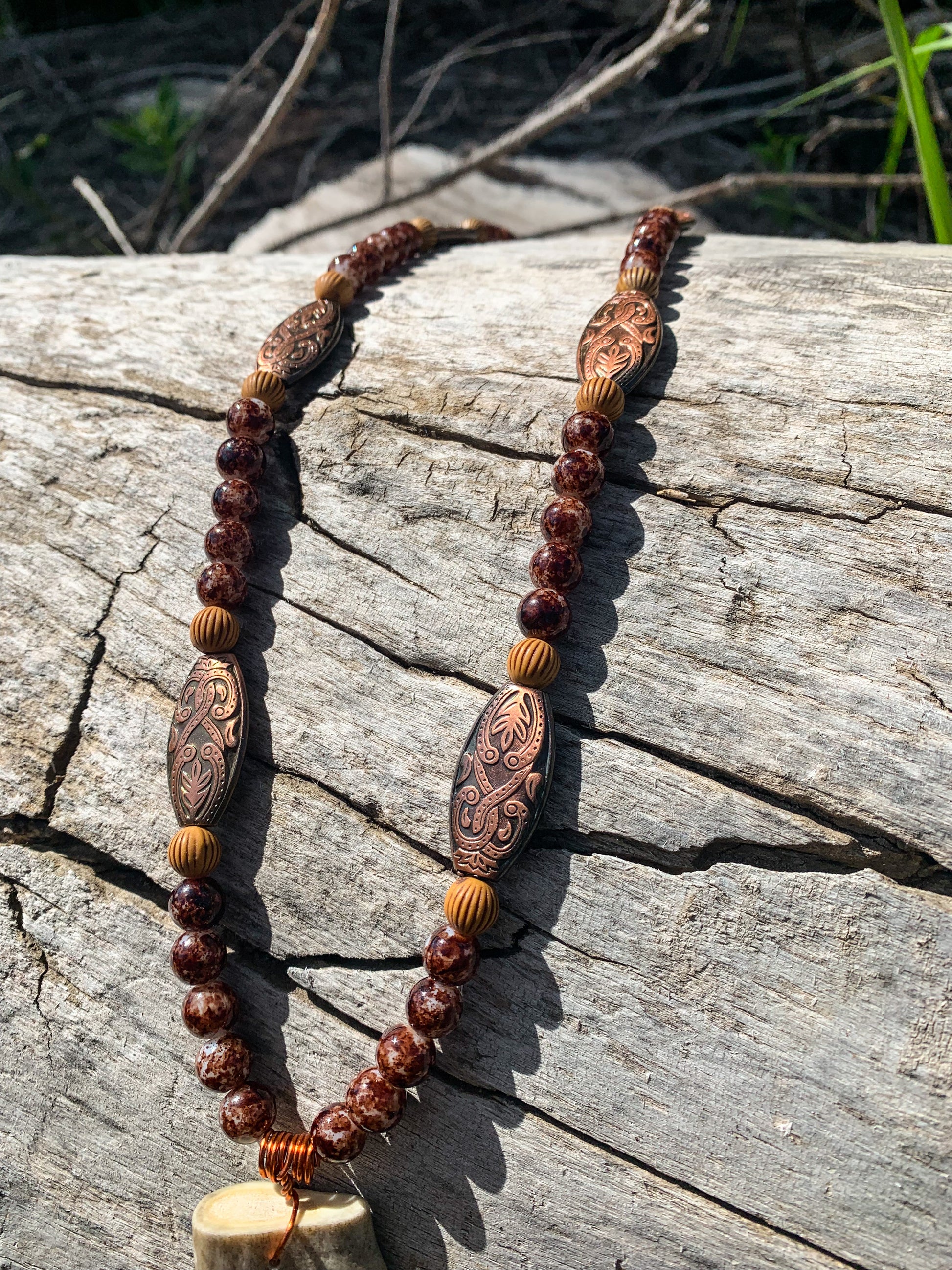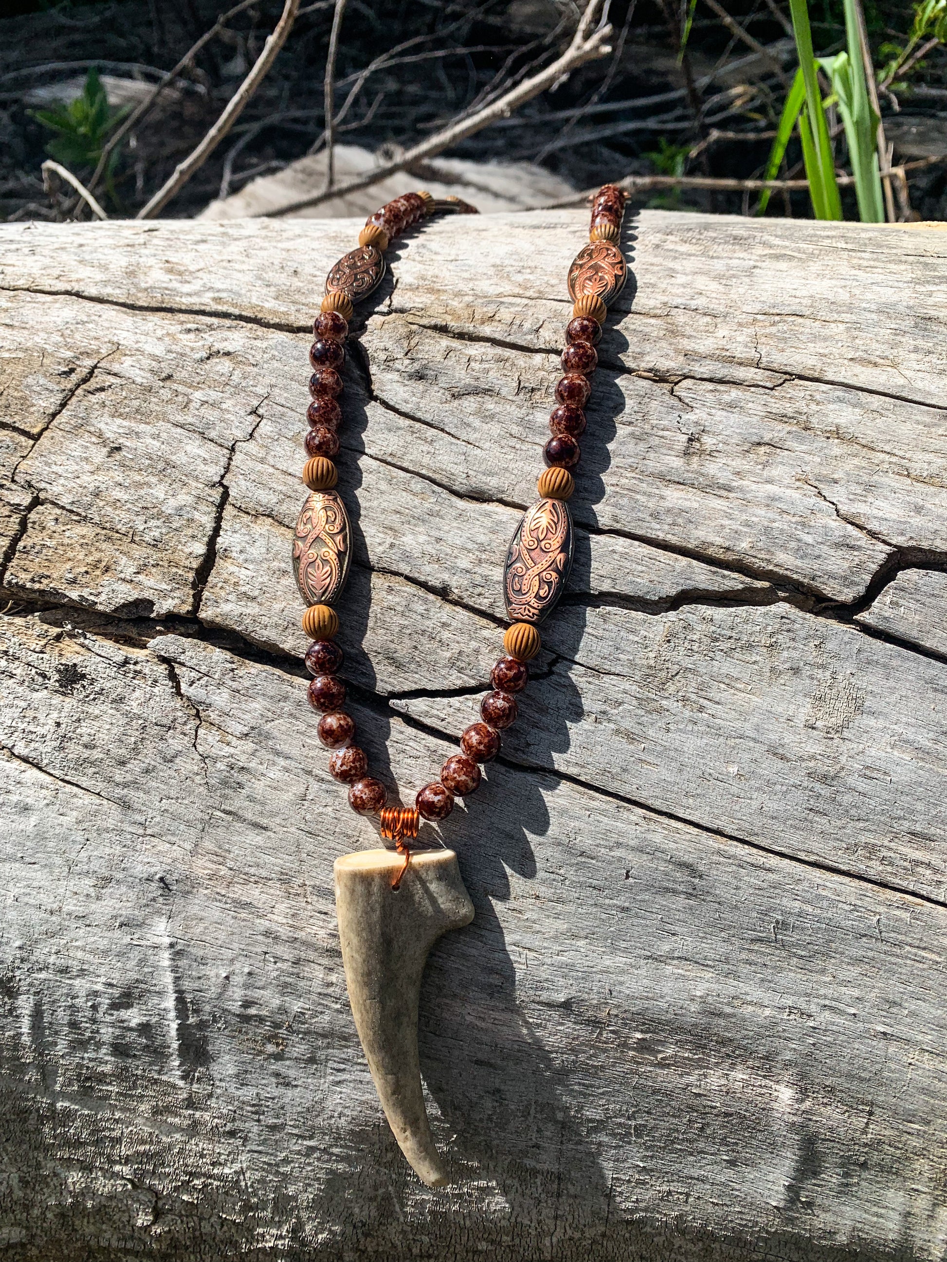 Tooled design slab pieces with brown beads surrounding. Unique authentic antler piece.