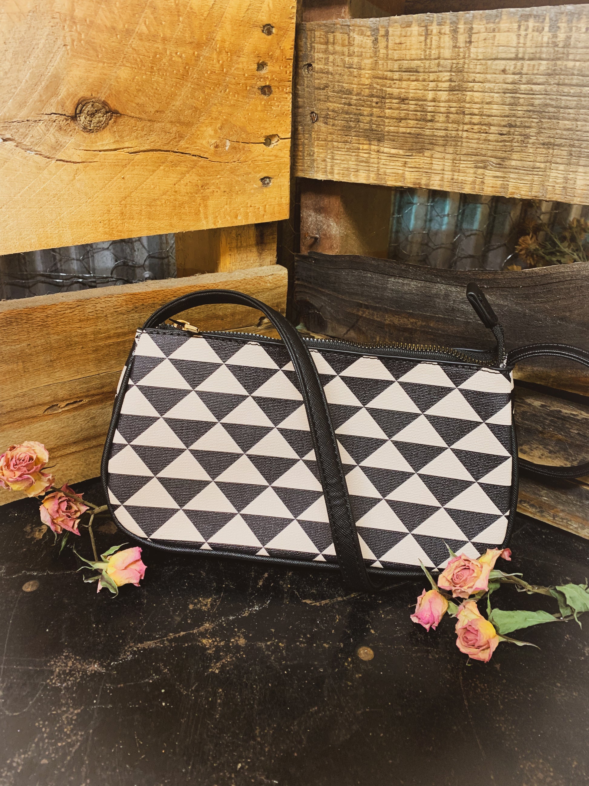 A fun triangle checkered pattern purse with medium size strap and zipper closure.