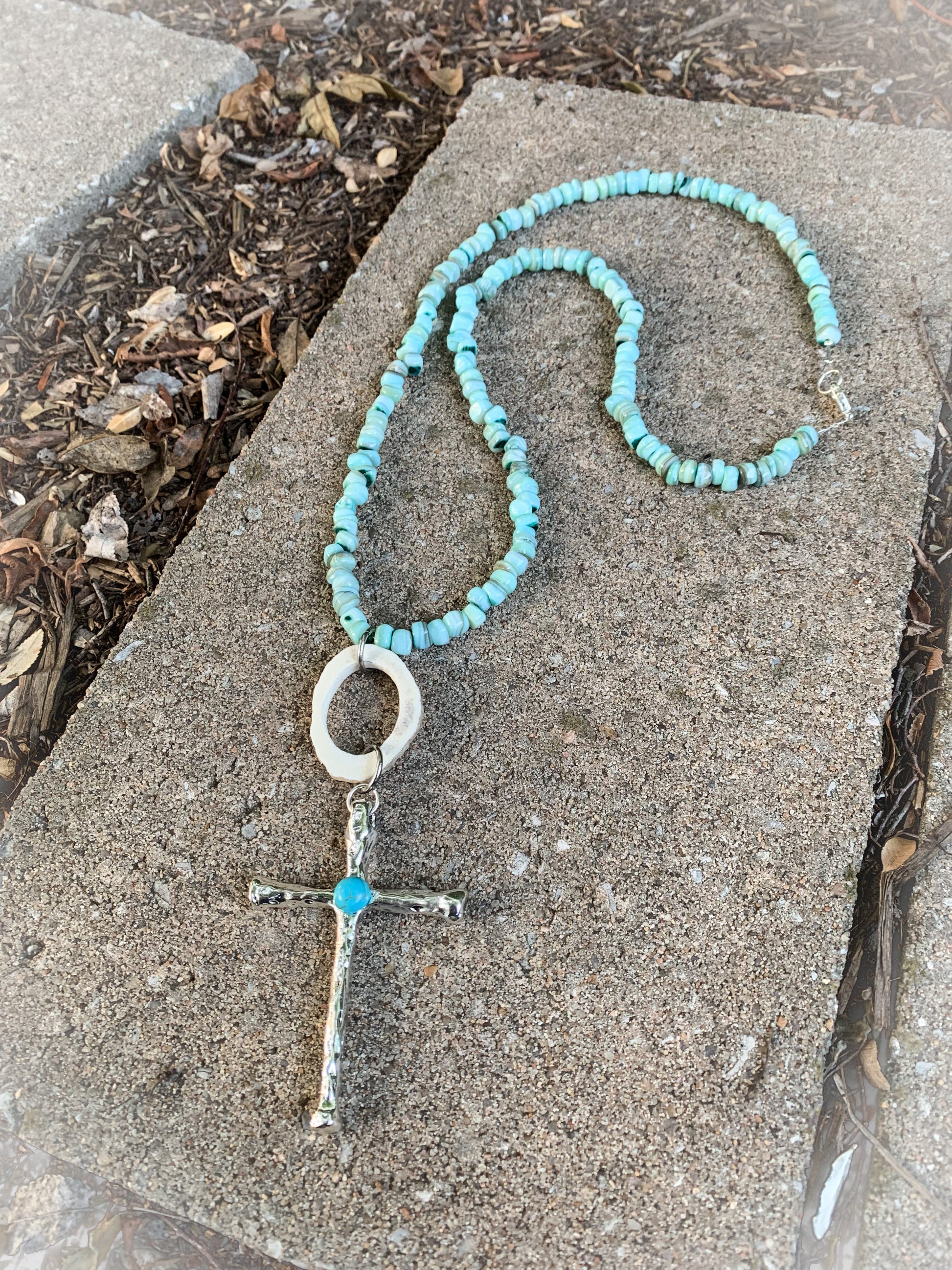 A beautiful elk antler piece hollowed out with a silver cross and turquoise stud inside on turquoise accent glass beads. Handmade.