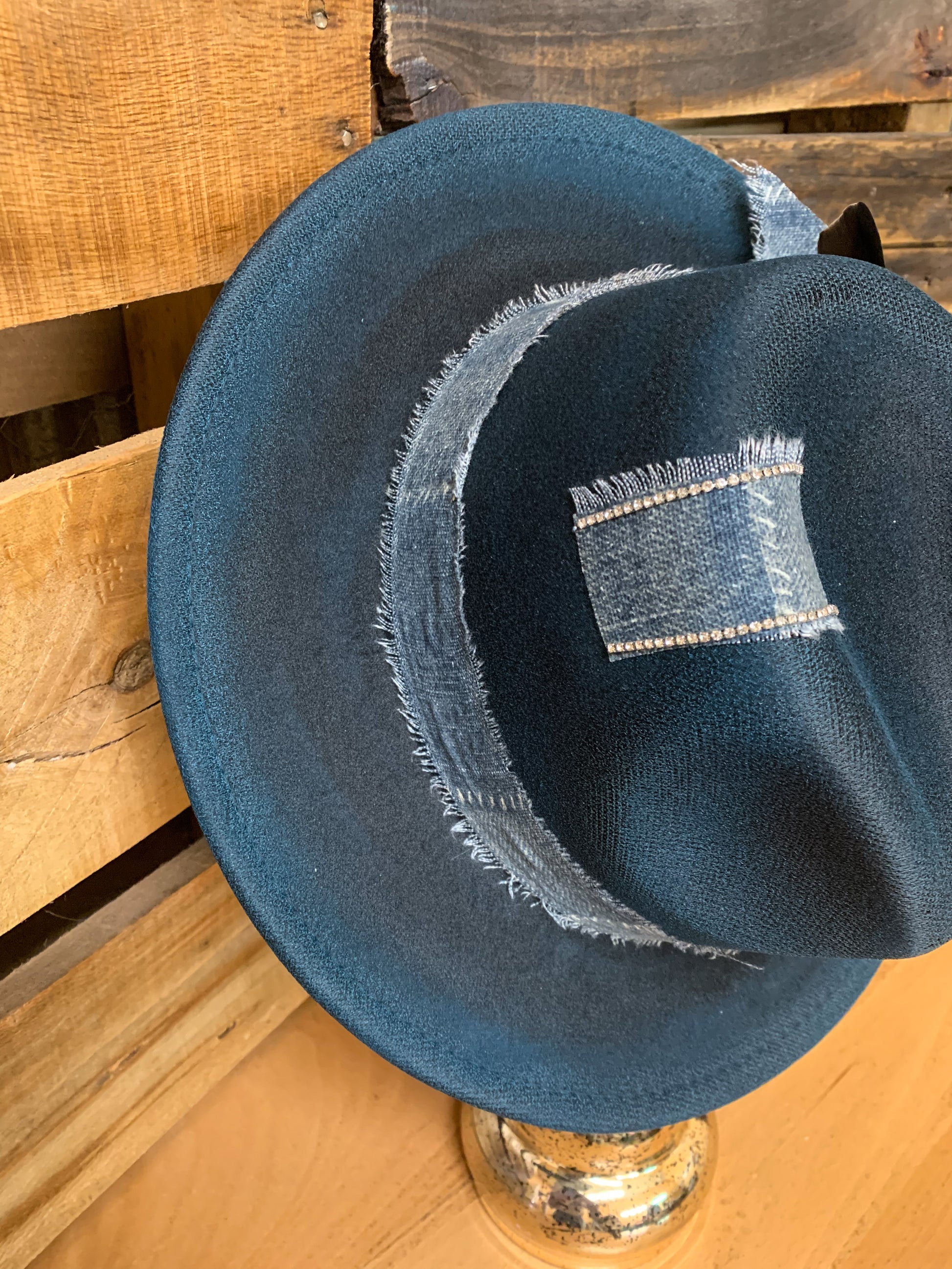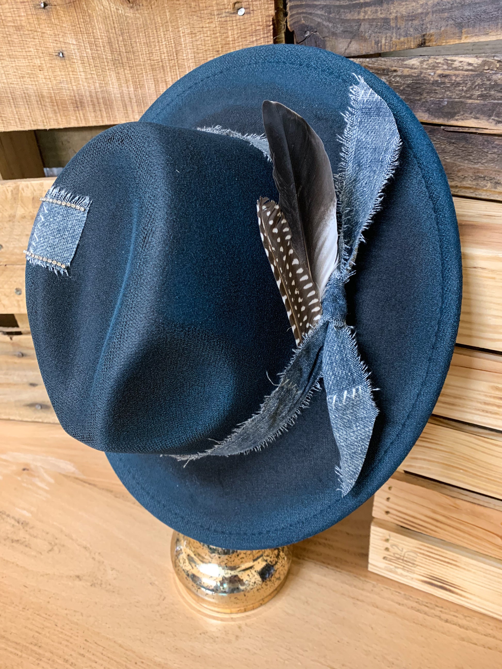 A fun teal colored hat with denim fabric wrapped around and two feathers on the side, with a denim and diamond patch on top! Adjustable drawstrings inside to tighten. 4.75” height. 2.75” brim. 22” circumference. 65% cotton, 35% polyester.
