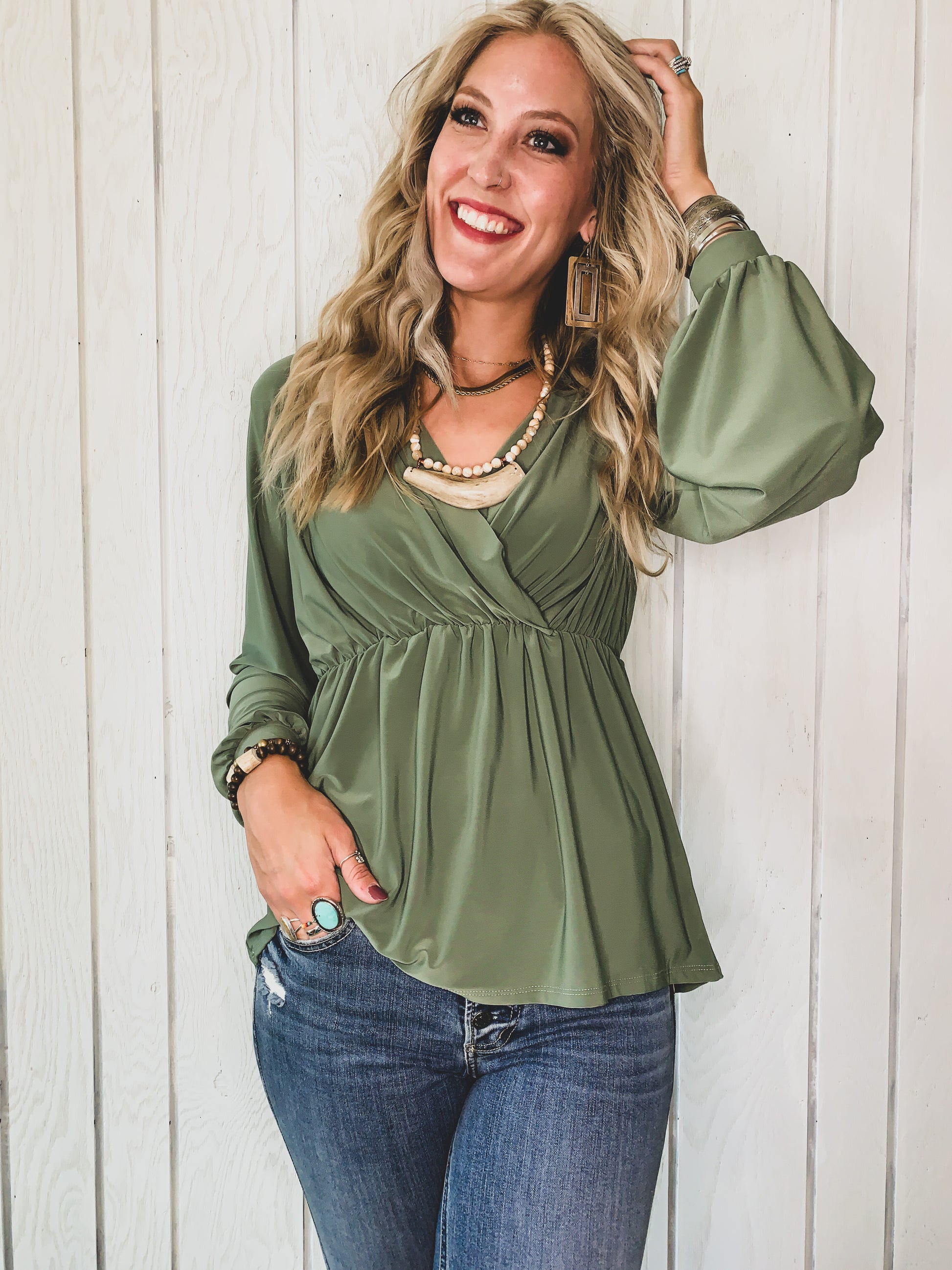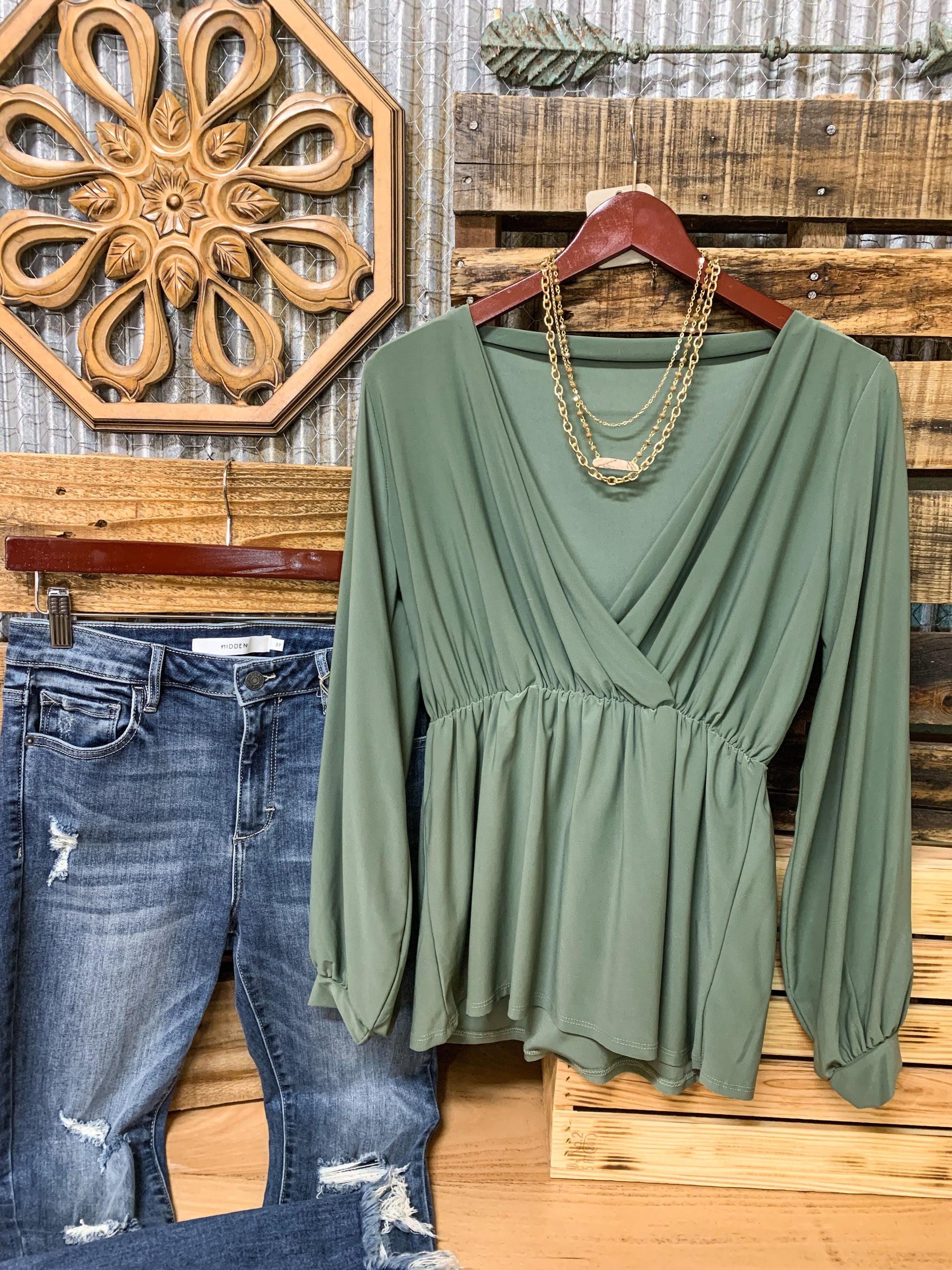 Elevate your style this season with this chic wrap front top! It’s form-hugging waist makes this a flirty go to for date nights!
