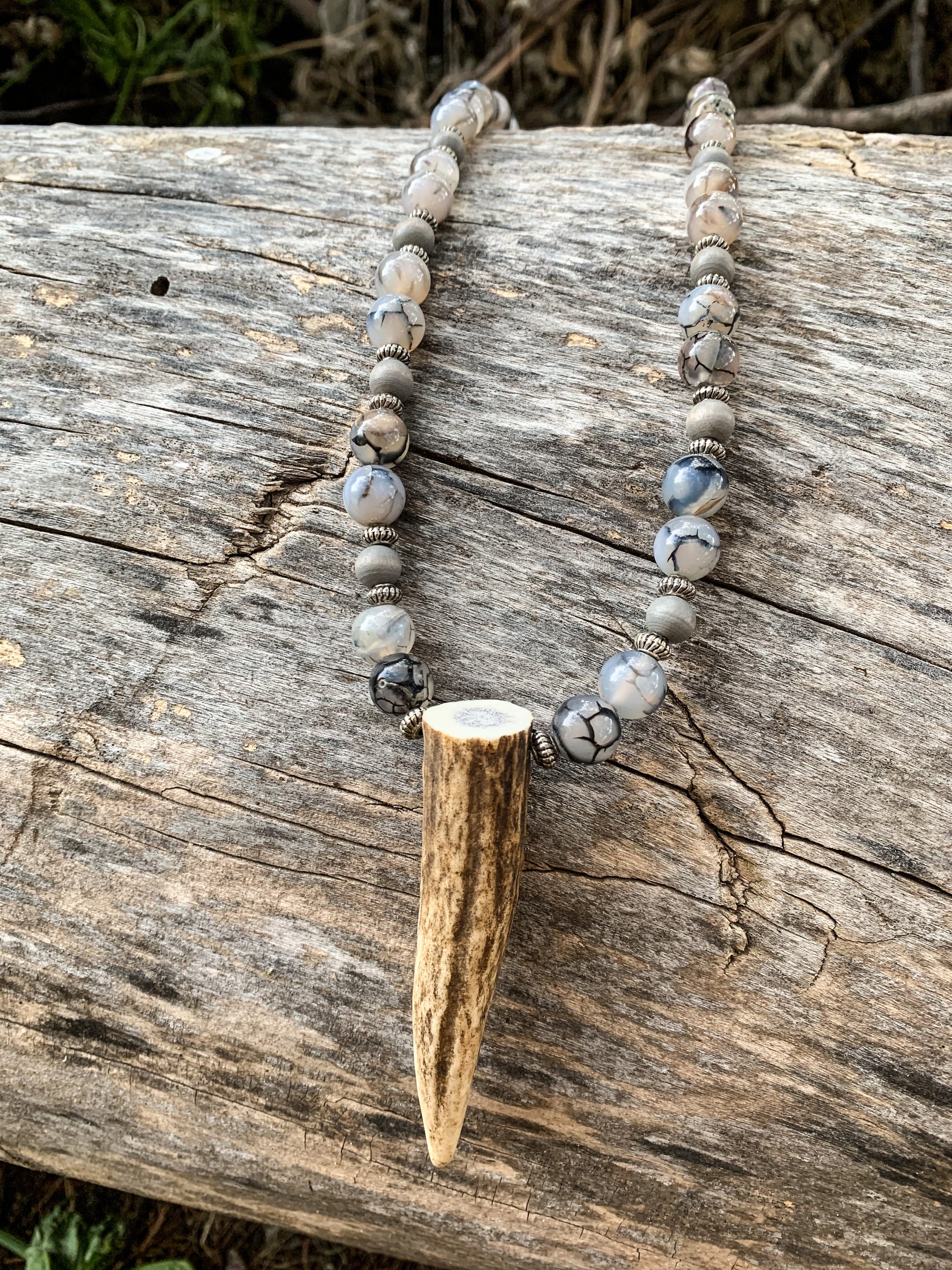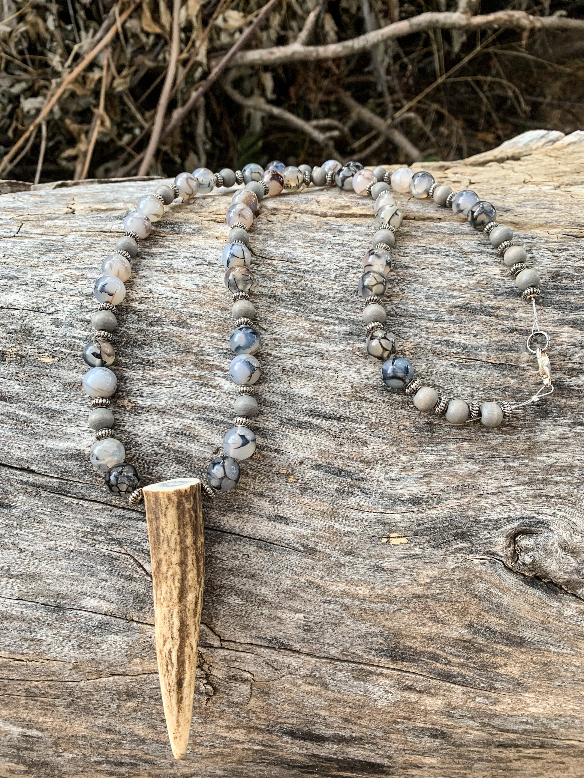 Beautiful gray/black glass beads with silver and gray accent pieces, and a small authentic elk antler point in the middle. Handmade.