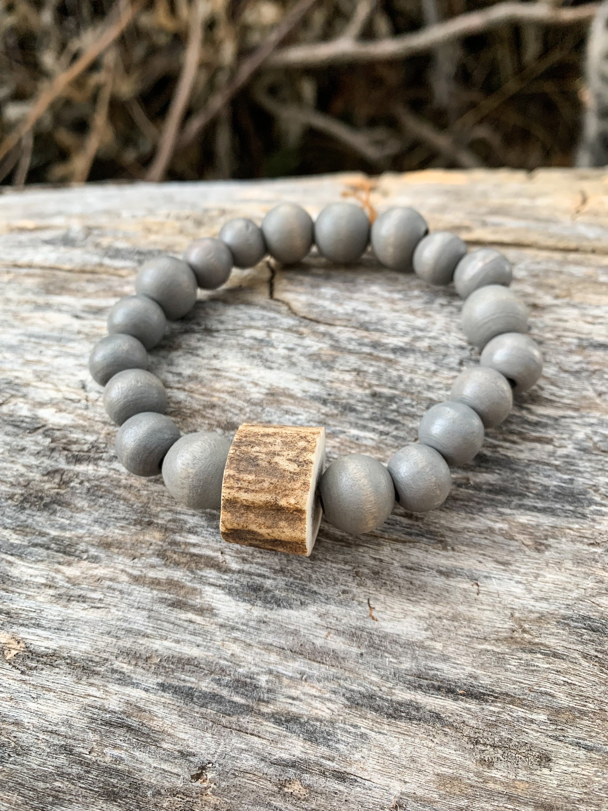 A beautiful authentic elk antler piece in between grey wooden beads. Handmade.