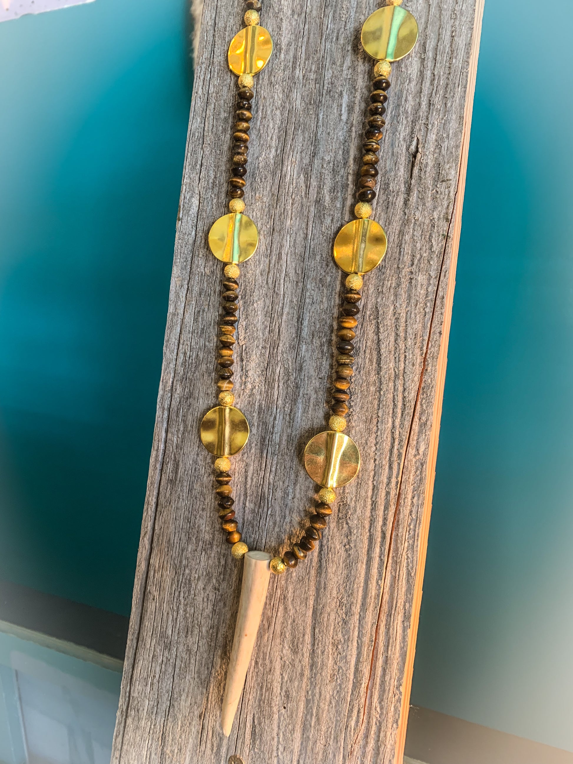 Beautiful golden slab pieces with brown beads around them, and a small authentic Whitetail antler point in the middle. Handmade.