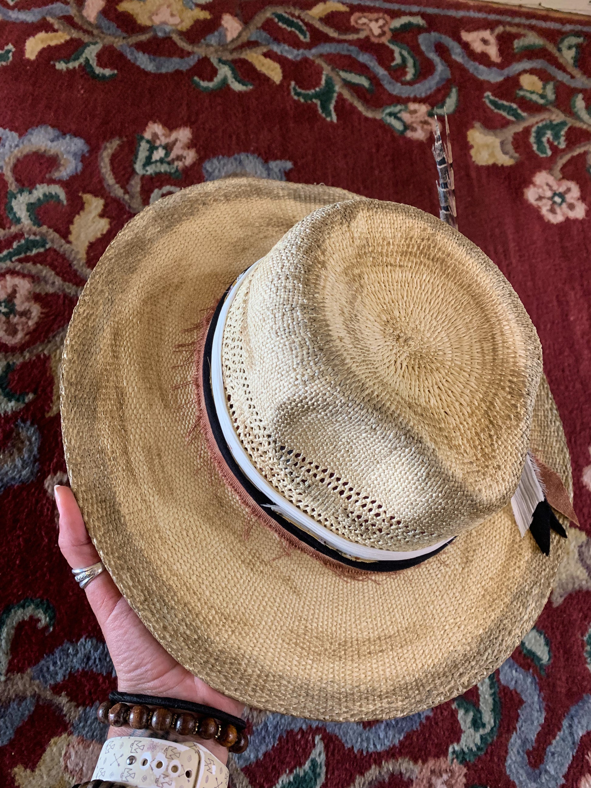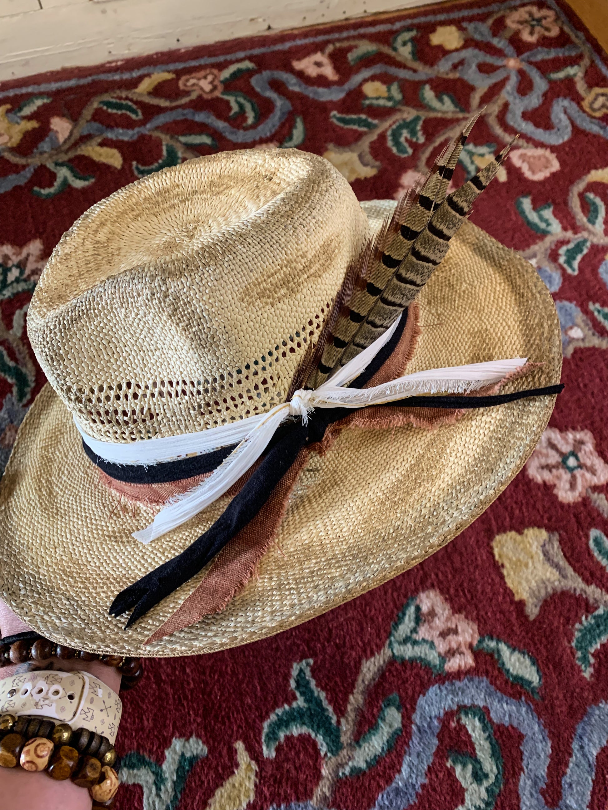 A fun light tan straw hat with paint design and three different fabrics wrapped around, and a pheasant feather on the side! 2.75” brim. 22.75” circumference. (Smaller average) Adjustable drawstrings inside to tighten.