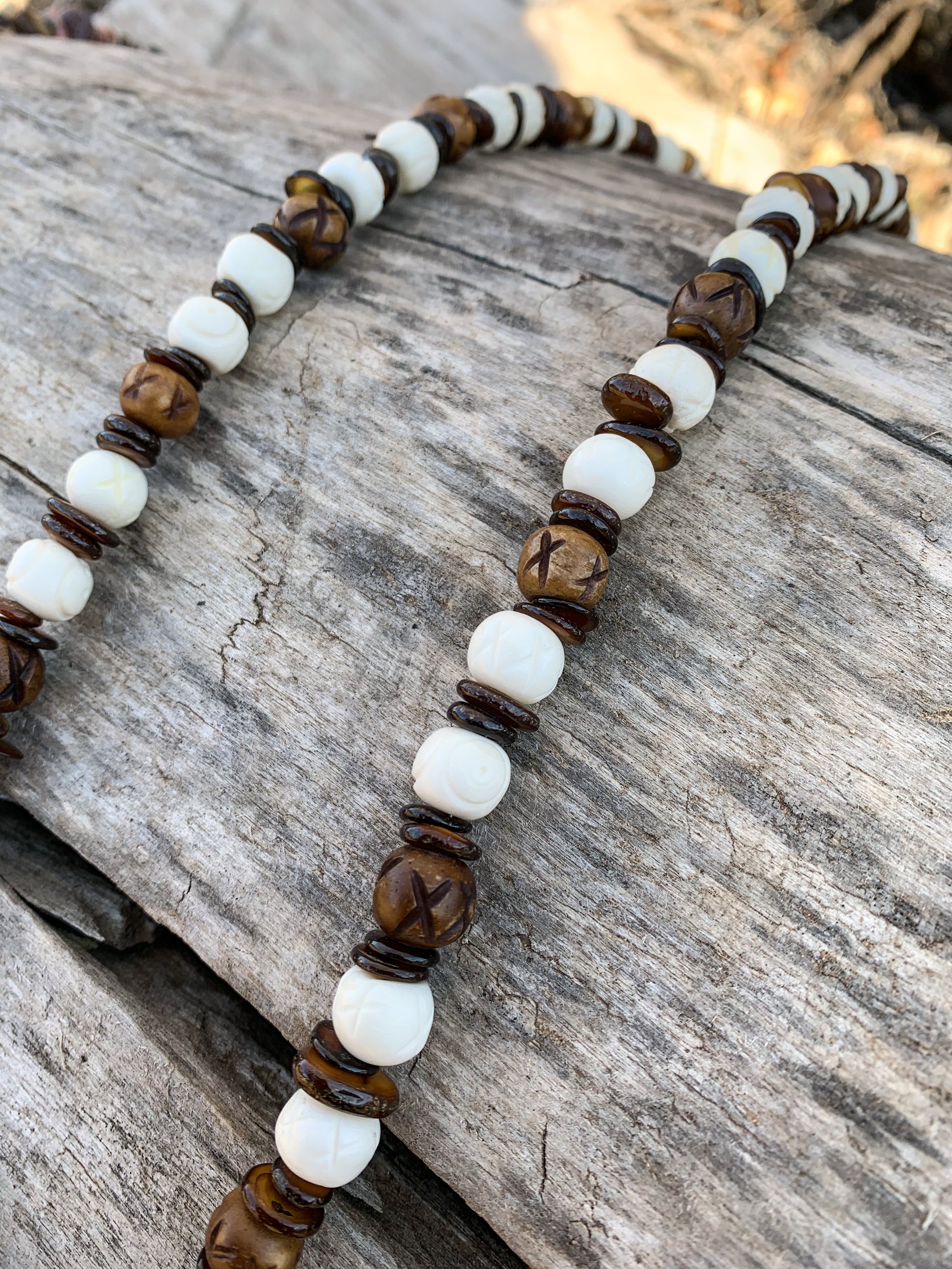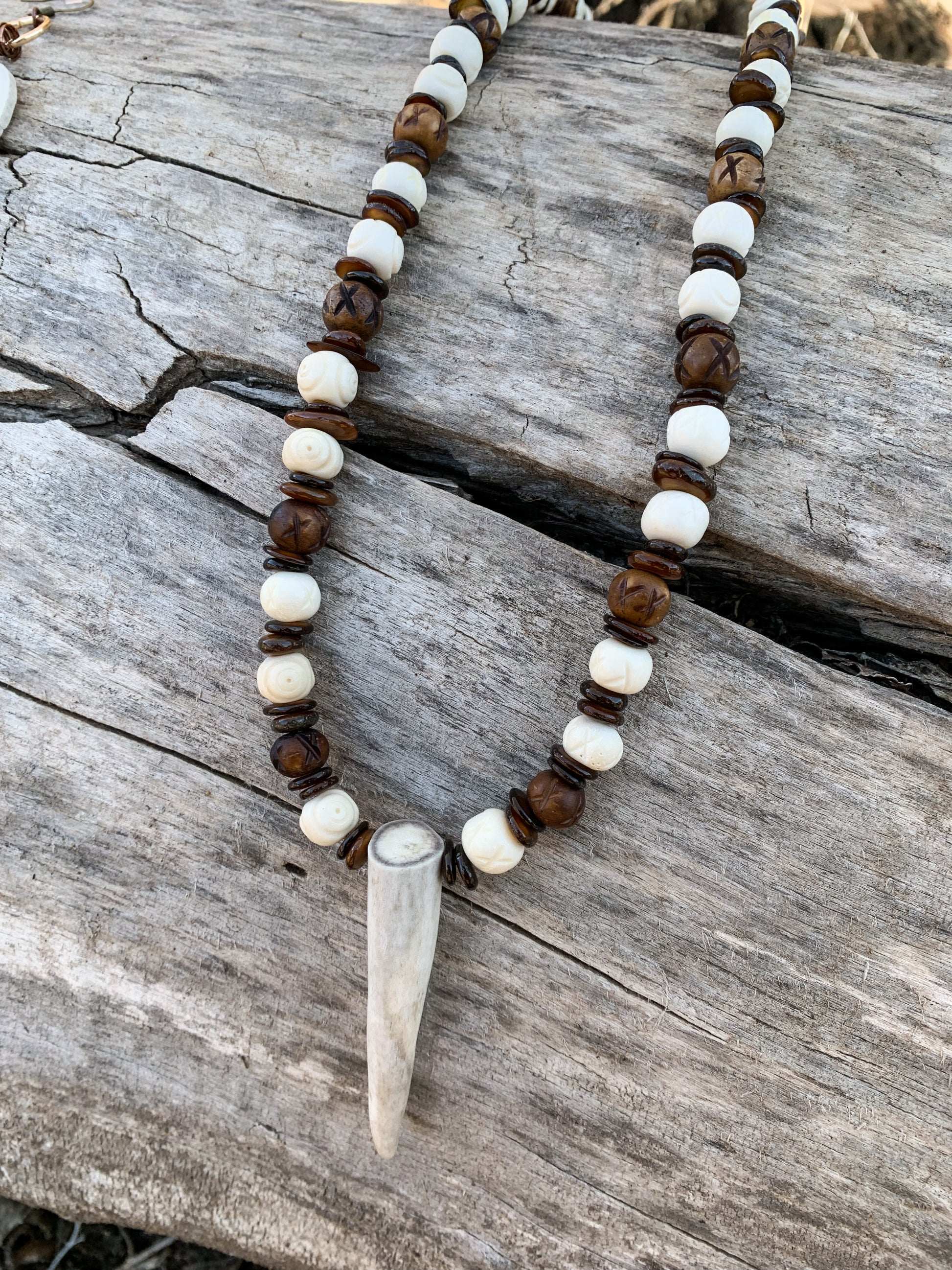 Fun wooden beads with X designs throughout them, and brown glass slab beads and a small antler point in the center.