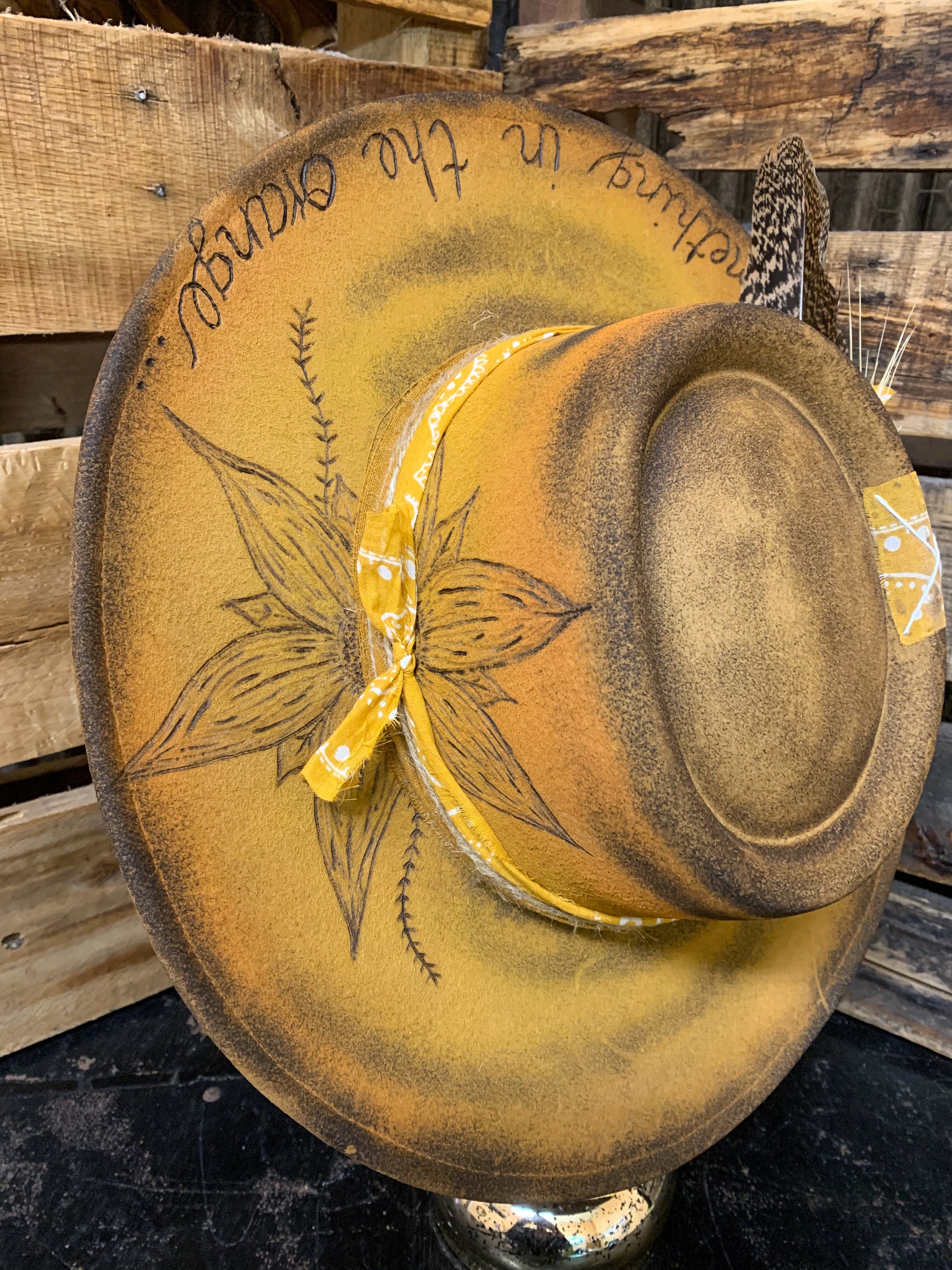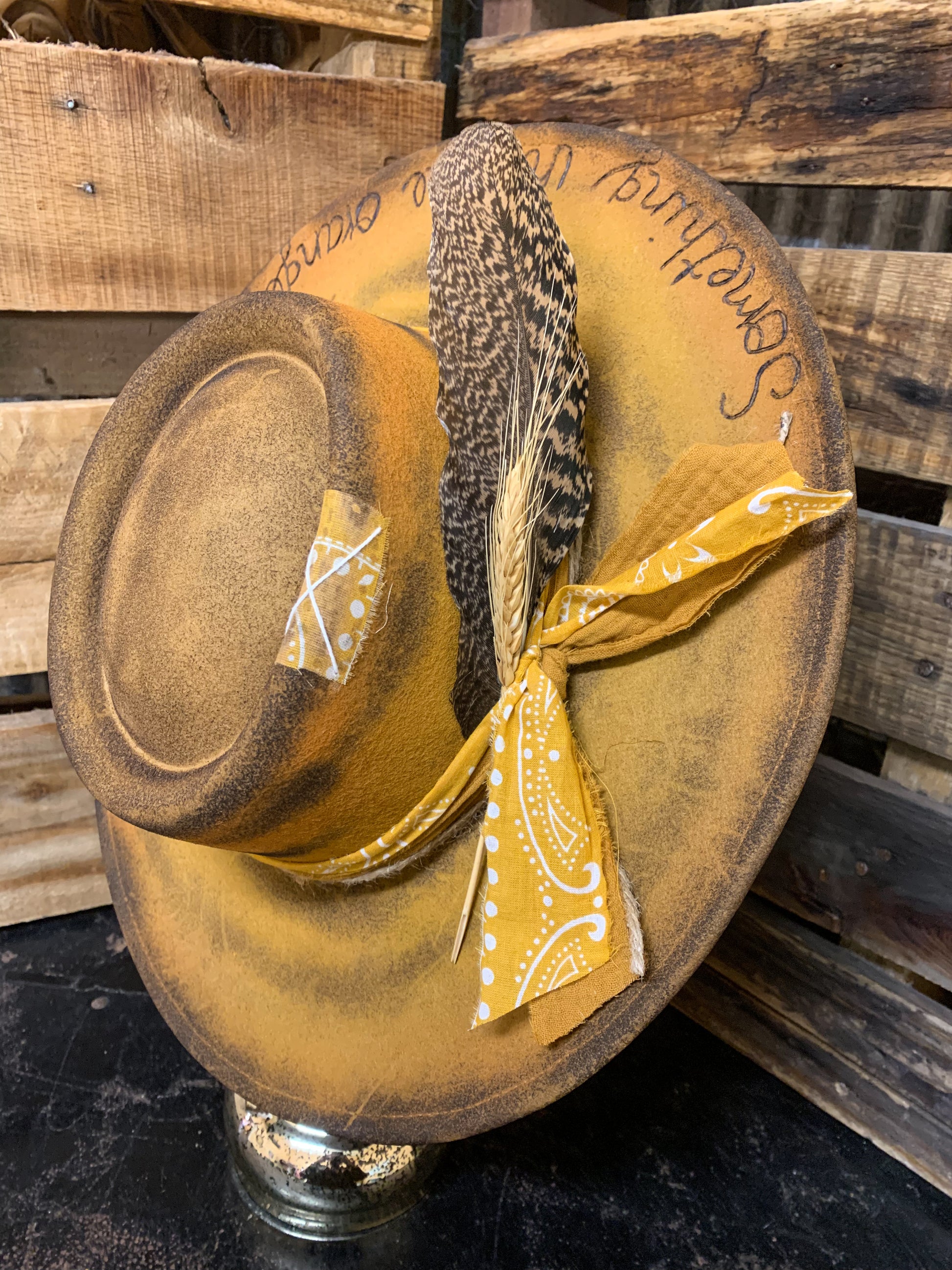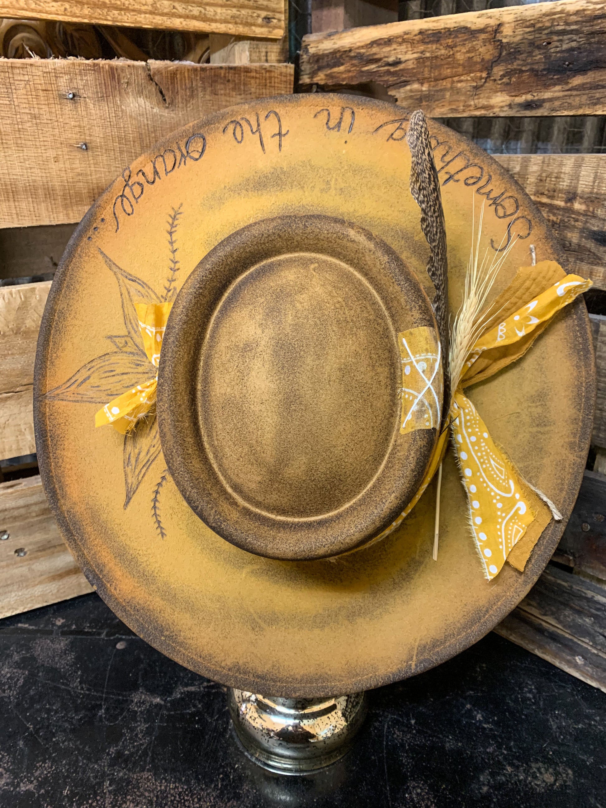 A beautiful wool, Zach Bryan “Something in the Orange” inspired hat, with a sunflower and lyrics burned into it. Two different fabrics wrapped around and tied on the side with a feather and piece of wheat. Adjustable drawstrings inside to tighten down if needed. 4” brim.